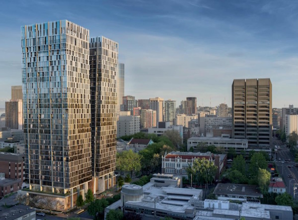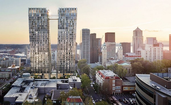 Two 34-story residential towers located across the street from the Frye Art Museum. The three-level podium will include space for a restaurant, café and other retail uses, as well as artwork displayed in the lobby. The tower will also have six floors of underground parking for both residential and commercial use.